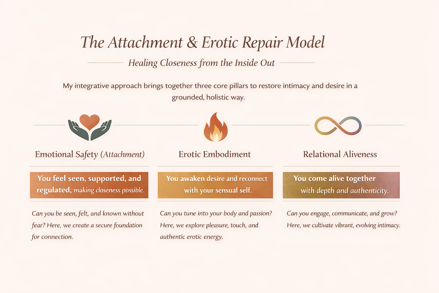 This work helps restore erotic aliveness by addressing attachment patterns, power dynamics, and the places where intimacy became effortful instead of alive.